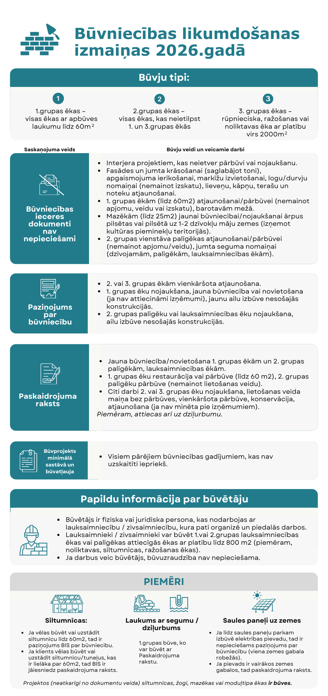 Savukārt citos gadījumos jāiesniedz paziņojums par būvniecību vai paskaidrojuma raksts, bet sarežģītākos projektos – būvprojekts minimālā sastāvā un jāsaņem būvatļauja.
