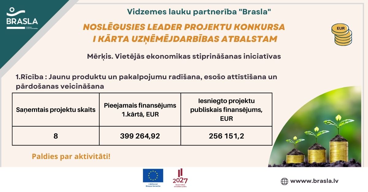 Projektu konkurss norit atbilstoši Vidzemes lauku partnerības "Brasla" SVVA stratēģijai 2023.-2027. gadam un 2023. gada 10. oktobra Ministru kabineta noteikumiem Nr.580 Valsts un Eiropas Savienības atbalsta piešķiršanas kārtība Eiropas Lauksaimniecības fonda lauku attīstībai intervencē "Darbību īstenošana saskaņā ar sabiedrības virzītas vietējās attīstības stratēģiju, tostarp sadarbības aktivitātes un to sagatavošana" aktivitātē "Vietējās ekonomikas stiprināšanas iniciatīvas".