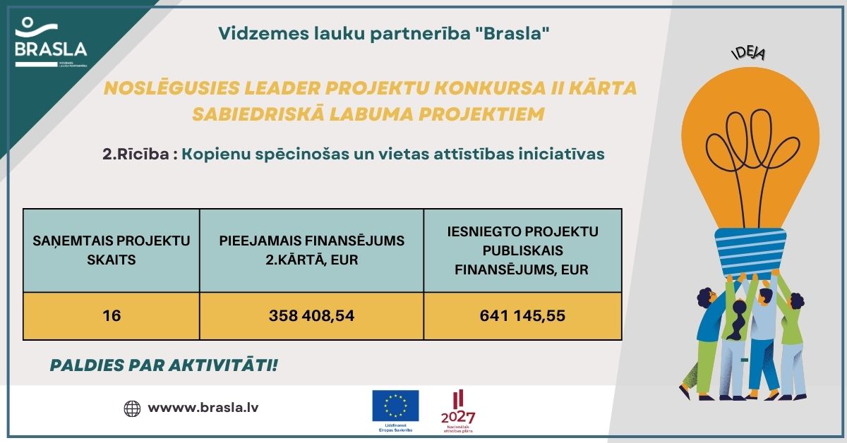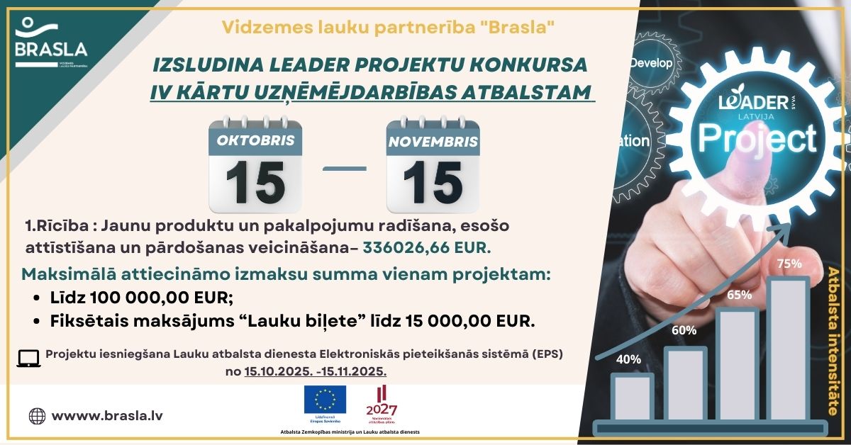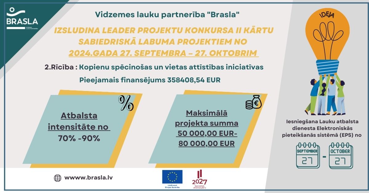 Vidzemes lauku partnerība "Brasla" izsludina LEADER projektu konkursa II kārtu sabiedriskā labuma projektiem no 2024. gada 27. septembra līdz 27. oktobrim.