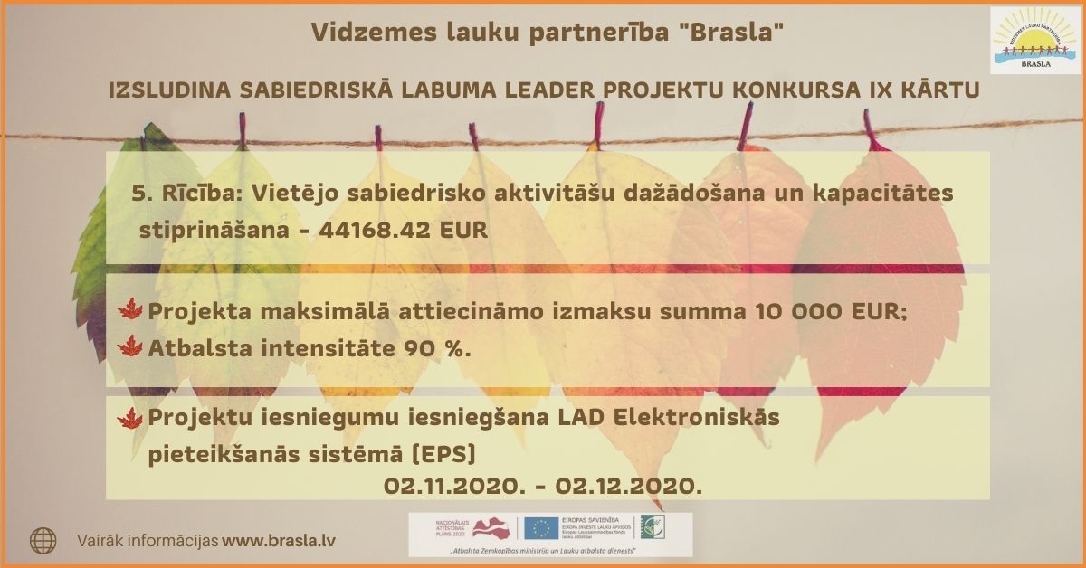 2020. gada 2. decembrī noslēdzās Vidzemes lauku partnerības “Brasla” izsludinātā LEADER projektu konkursa IX kārta.