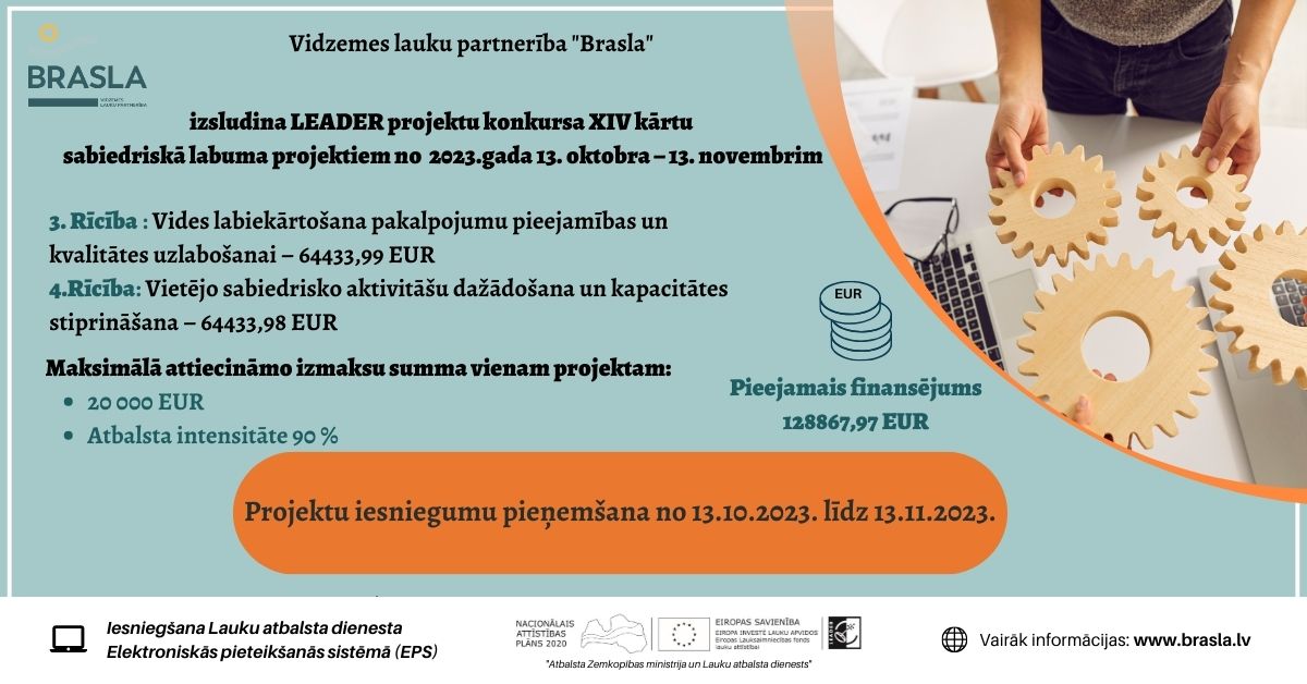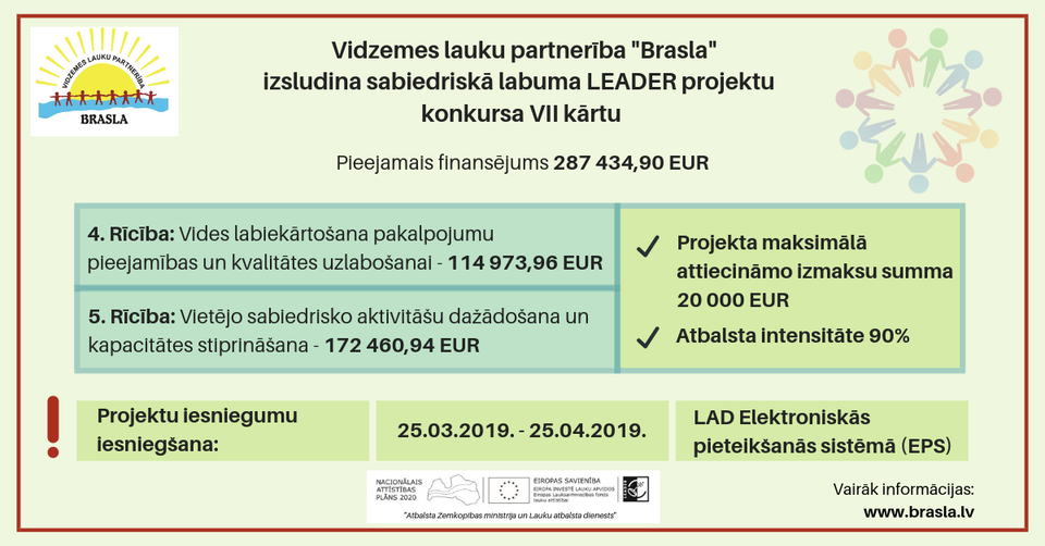 Vidzemes lauku partnerība "Brasla" no 2019. gada 25. marta līdz 2019. gada 25. aprīlim izsludina LEADER projektu konkursa VII kārtu sabiedriskā labuma projektu atbalstam.