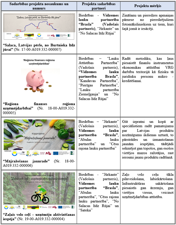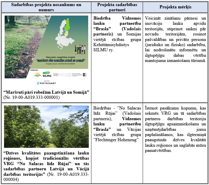 Vidzemes lauku partnerība “Brasla” ir īstenojusi vienu starpteritoriālo sadarbības projektu un vienu starpvalstu sadarbības projektu, kā projekta partneris ir iesaistījusies trīs starpteritoriālos sadarbības projektos un vienā starpvalstu sadarbības projektā.