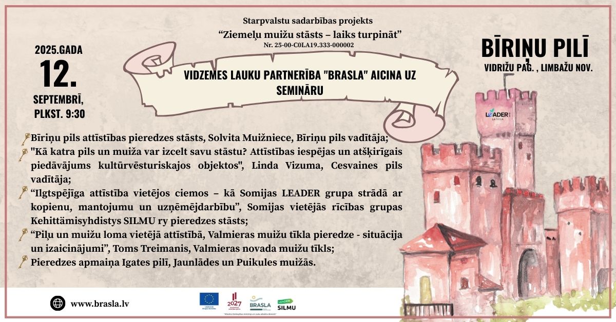 Vidzemes lauku partnerība "Brasla" sadarbībā ar Somijas vietējo rīcības grupu Kehittämisyhdistys SILMU ry, starpvalstu sadarbības projekta "Ziemeļu muižu stāsts- laiks turpināt", projekta Nr. 25-00-C0LA19.333-000002, ietvaros, aicina piedalīties starptautiskā kultūrvēstures seminārā.
